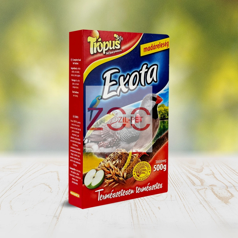 A TRÓPUS exota eleség speciálisan a díszpintyek számára összeállított keverék, amely tápanyagtartalmánál fogva biztosítja a fejlődést, a megfelelő kondíció megtartását, a dús tollazatot, az ép és erős csontozatot, az egészséges és hosszú életet.